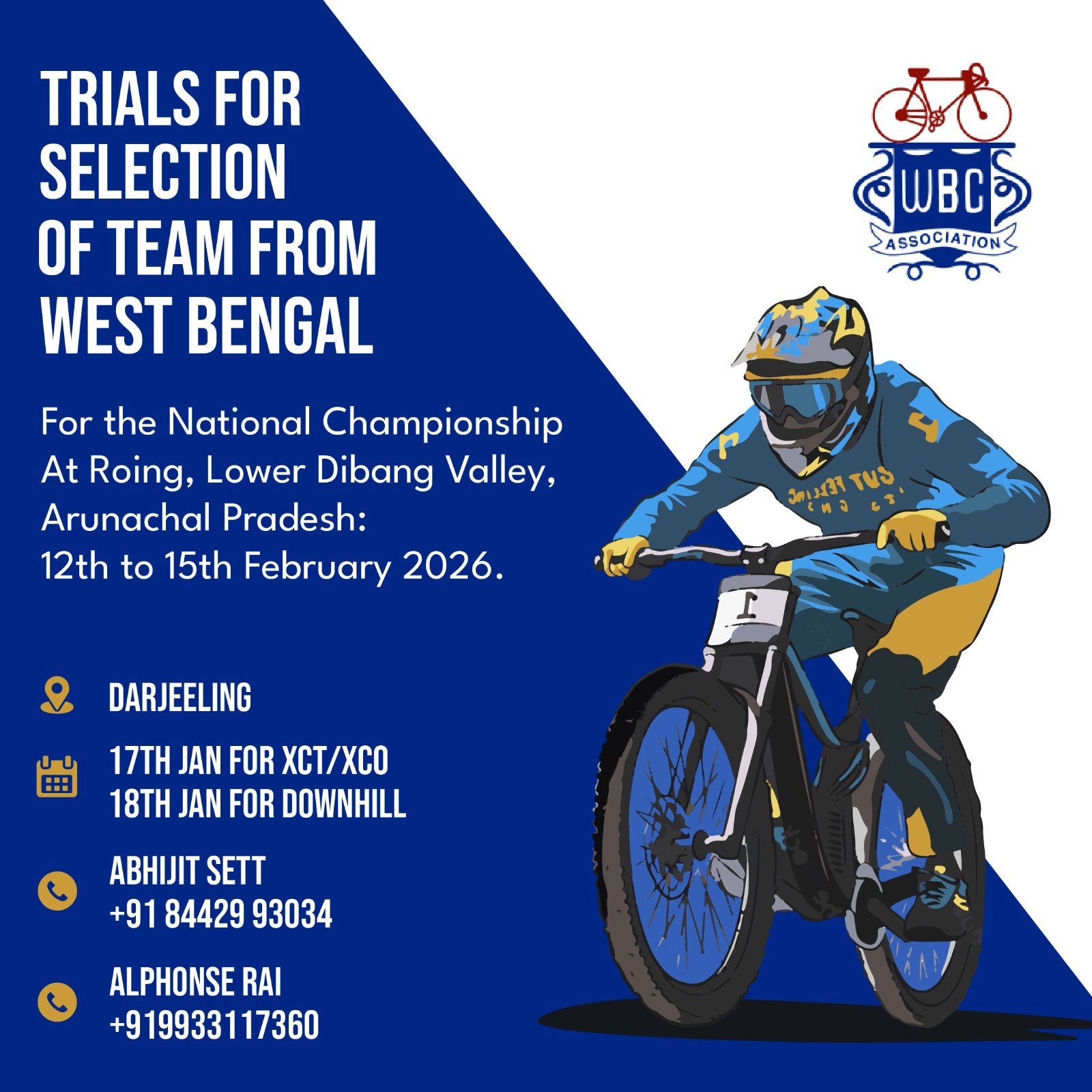 Selection trials for riders representing West Bengal at the National MTB Championship at Roing, Arunachal Pradesh | 12–15 Feb 2026